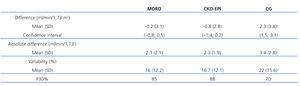 Table 2 shows the values for concordance between glomerular filtration rate as measured using the mean of urine clearance of urea and creatinine and the different estimating equations. MDRD and CKD-EPI had a slight negative bias (mean difference of -0.2ml/min/1.73m2 and -0.8ml/min/1.73m2, respectively). For CG, the bias was positive, with a mean overestimation of glomerular filtration rate of 2.3ml/min/1.73m2. CG was the equation with the greatest level of variability. The value of P30% for CG confirmed that this method had the worse concordance with glomerular filtration rate as measured by ClUrCr. The level of concordance with MDRD and CKD-EPI was similar, and there were no significant differences between these two methods in any of the parameters analysed, except for the difference (P<.01).