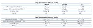 Table 3 shows the results of the concordance analysis based on the stage of chronic renal failure. MRDR and CDK-EPI had a similar level of concordance for both stages analysed. CG had a worse concordance in stage 5 CKD patients.